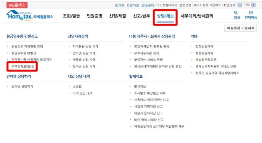 그럼 현금영수증을 발급받으려면 불편하게 집주인에게 연락해야 할까요? 답은 아닙니다. 국세청 홈택스에서 직접 발급을 신청할 수 있습니다. 홈택스 상담/제보 주택임차료(월세)에서 현금영수증 발급을 미리 신청하시면 됩니다. 아래 버튼을 통해 쉽고 간편하게 홈택스 현금영수증 발급 신청하시기 바랍니다.